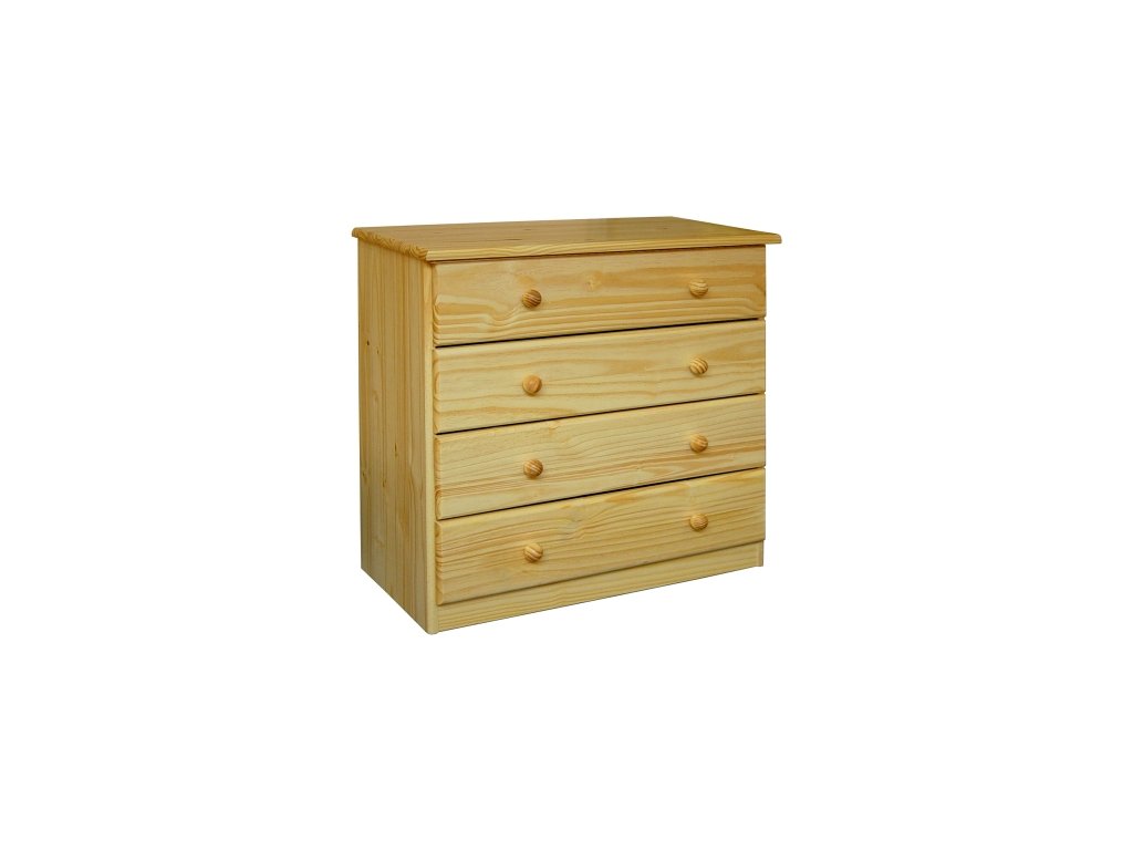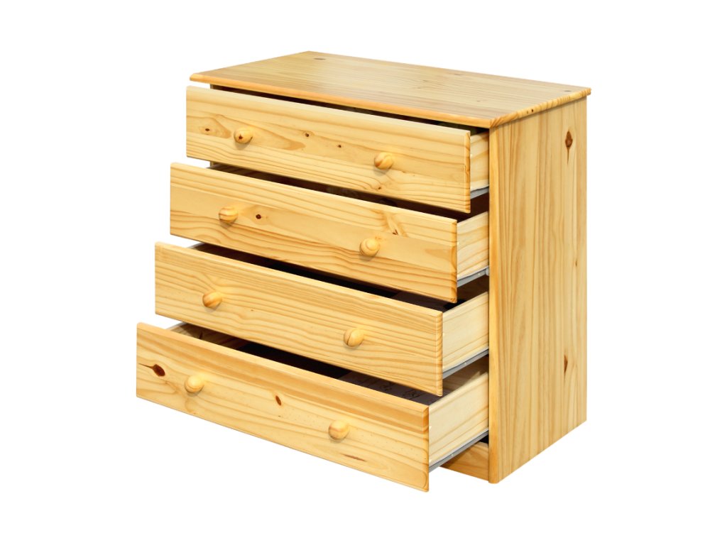 Borovicový masiv, 4 široké zásuvky s kovovými pojezdy, hloubka zásuvky 32,5 cm.