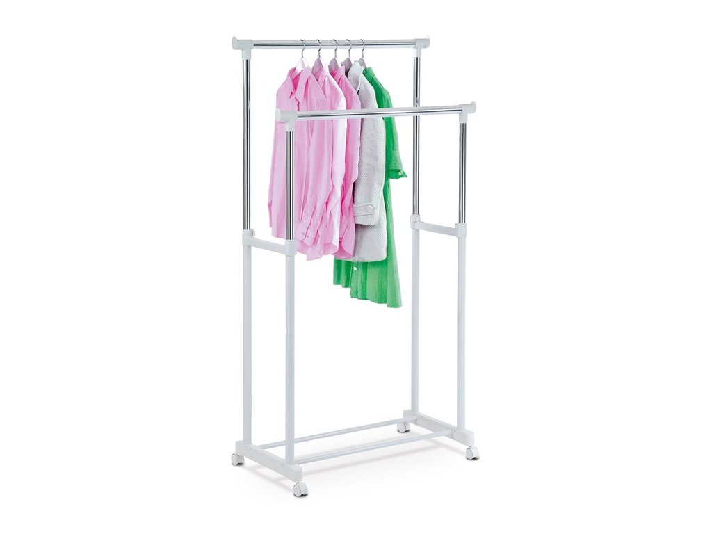 Černý, bílý. Dvojramenný stojan na šaty kombinuje pevný kovový rám s plastovými prvky pro stabilitu a snadnou manipulaci. Výškově nastavitelná horní tyč umožňuje přizpůsobení podle potřeby, což zajišťuje optimální využití prostoru a pohodlné zavěšení oděvů různých délek.