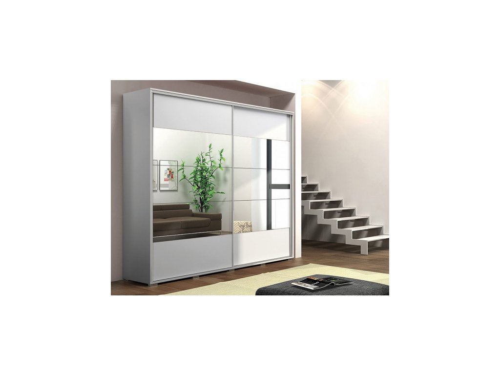 Hrany opatřeny kvalitní ABS. nábytková deska 16 mm. Hliníkové pojezdy. Dodáváme v demontu. Dveře se otevírají pomocí kovových lišt po stranách. Na dveřích je 6 pruhů zrcadel 0,4 mm.