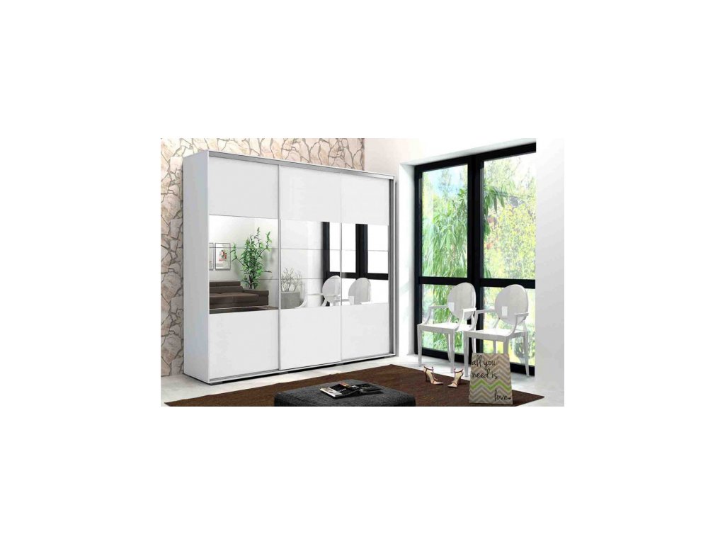 Šatní skříň s posuvnými dveřmi, dostupná ve více barevných kombinacích. Hrany opatřeny kvalitní ABS. nábytková deska 16 mm. Hliníkové pojezdy. Dodáváme v demontu. Vnitřní vybavení -  police, 2x šatní tyč na ramínka. Možno doobjednat zásuvky do skříně a osvětlení skříně. 3 pásy zrcadel.