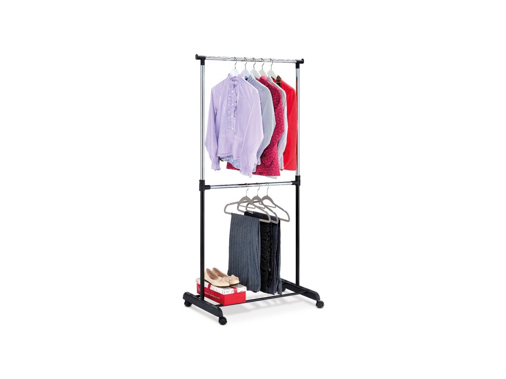 dvojramenný s odkladačem, s pojezdem bez aretace Doporučená nosnost je 7 kg rovnoměrně rozložené zátěže na obě ramena dohromady (3,5 kg rameno). Stojan je určený do domácností a není určen pro zátěžový provoz. Výškově nastavitelný. Dodáváno v demontovaném stavu. černý, bílý -  barva, kov / plast, chrom