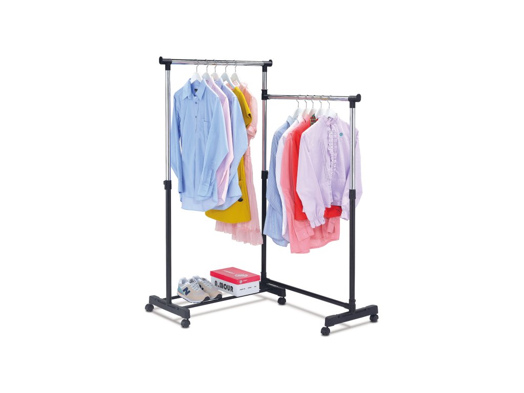 Stojan na šaty, otočný o 360°, s pojezdem bez aretace v provedení chrom / černá barva kovu a plastu a praktickým odkladačem tvořeným dvěmi kovovými spojovacími trubkami na uložení krabic či obuvi. Doporučená nosnost je 10 kg rovnoměrně rozložené zátěže na obě ramena (5 kg na jedno rameno). Stojan je určený do domácností a není určen pro zátěžový provoz. Výškově nastavitelný. Dodáváno v demontovaném stavu.