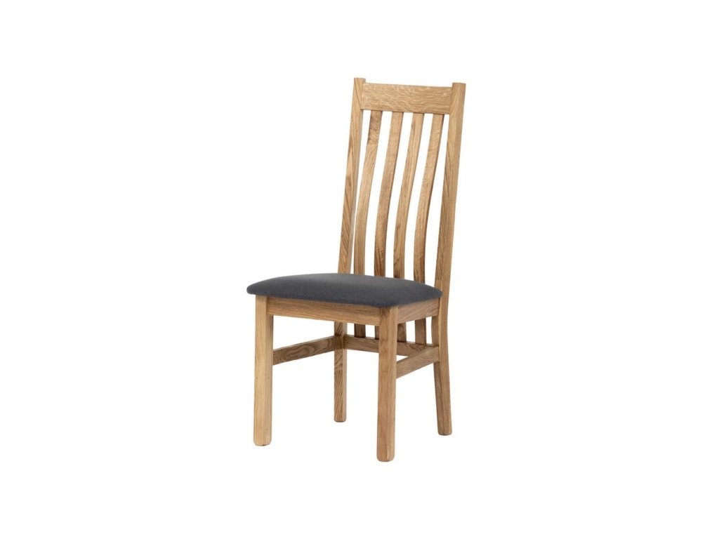 Dřevěná jídelní židle z masivního dubového dřeva. Ergonomicky tvarované vzpěry opěradla, kopírující zakřivení páteře. Pohodlný sedák je potažen odolnou látkou z polyesterových vláken.