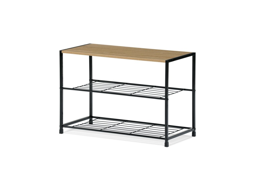 Botník s konstrukcí a odkládacími plochami z lehkého kovu v černé barvě. Půda je vyrobena z MDF desky s povrchovou úpravou 3D folie v odstínu dub sonoma.