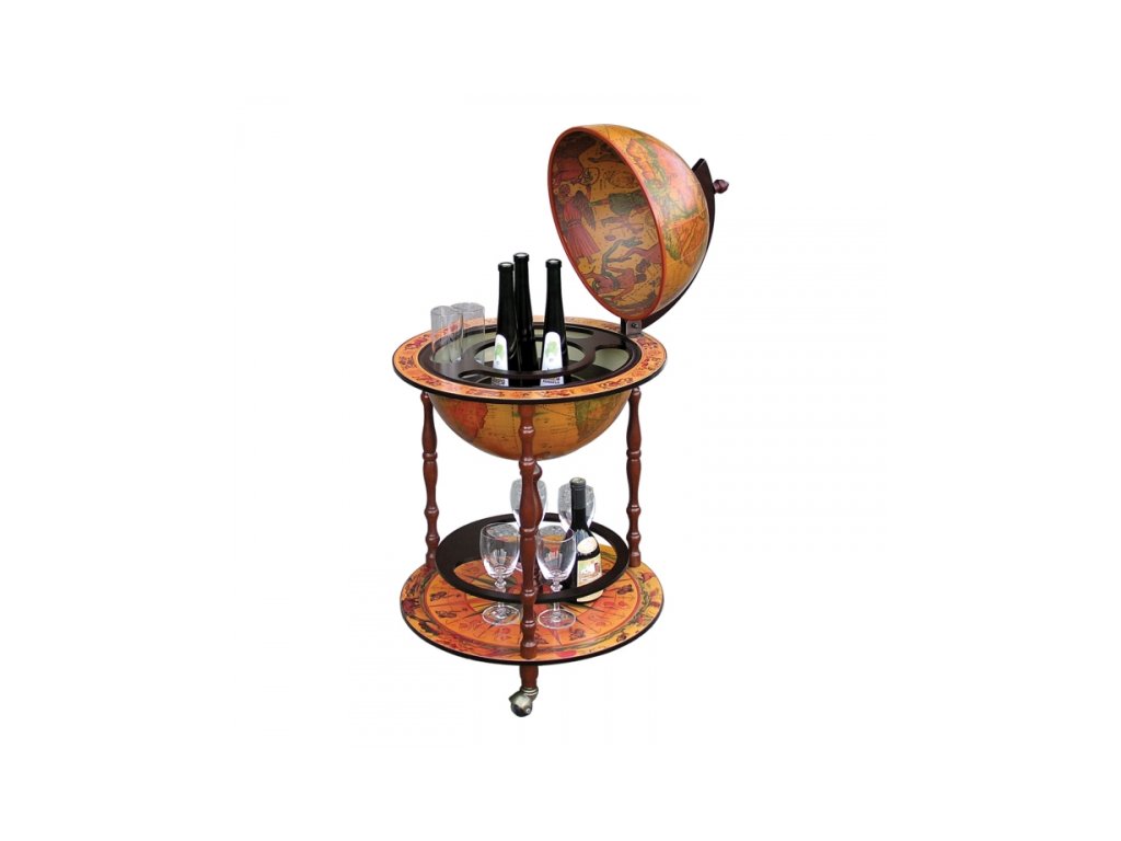 Popis: servírovací barový stolek se třemi nohami, na kolečkách, vrchní část otočná, materál: dřevo třešeň, MDF, plast, dodávaný v demontu.