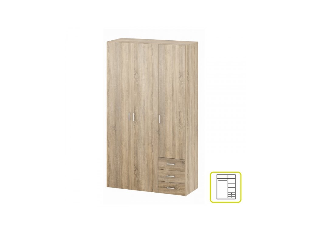 Popis: 3 - dveřová skříň s věšákovou tyčí policí a 3 zásuvkami, rozměry (ŠxVxH): 115,8x200,4x49,5 cm. Dodáváno v demontu. Hmotnost: 69,3 kg