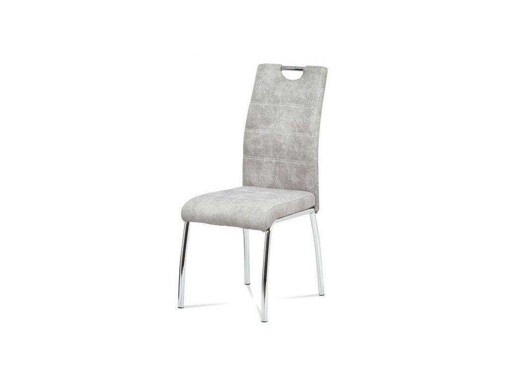 Jídelní židle, potah stříbrná látka COWBOY v dekoru vintage kůže s dekorativním bílým prošitím sedáku i opěráku. Líbivý design podtrhuje kovová podnož s chromovou úpravou. Podnož je navíc speciálně tvarovaná pro lepší stabilitu a bezpečí. Každá ze čtyř nohou je na černém plastovém kluzáku, což sníží riziko poškození Vaší podlahy. Pro snazší manipulaci má židle i madlo v horní části opěráku, které je kovové a též s chromovou úpravou. Nosnost židle je až 110 kg.Buďte první, kdo napíše příspěvek k této položce.