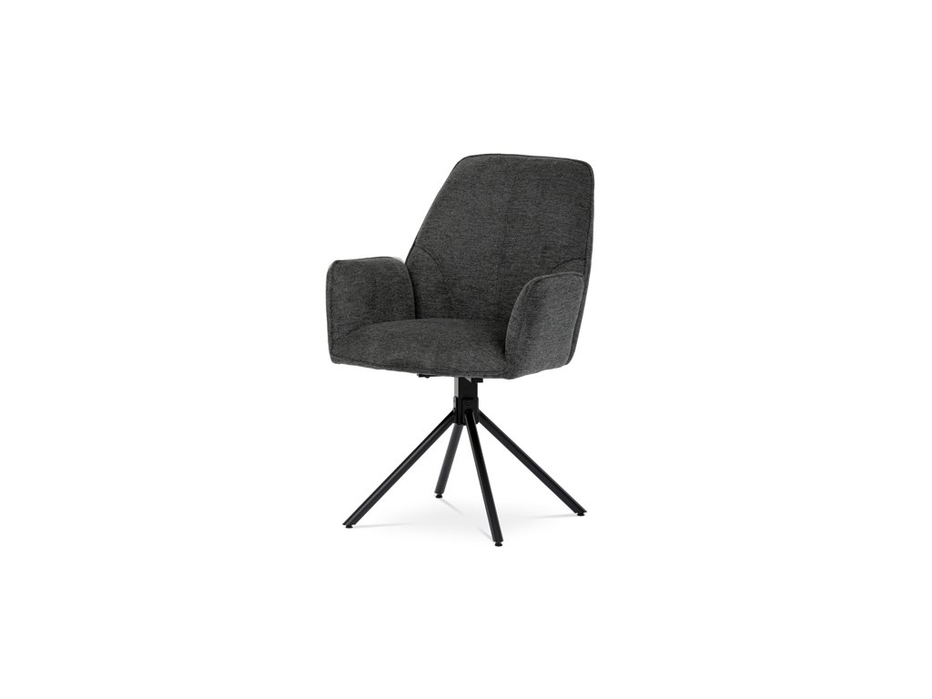 Jídelní židle v šedé látce s područkami, otočná s vratným mechanismem. Sedák je otočný P90°+ L 90°