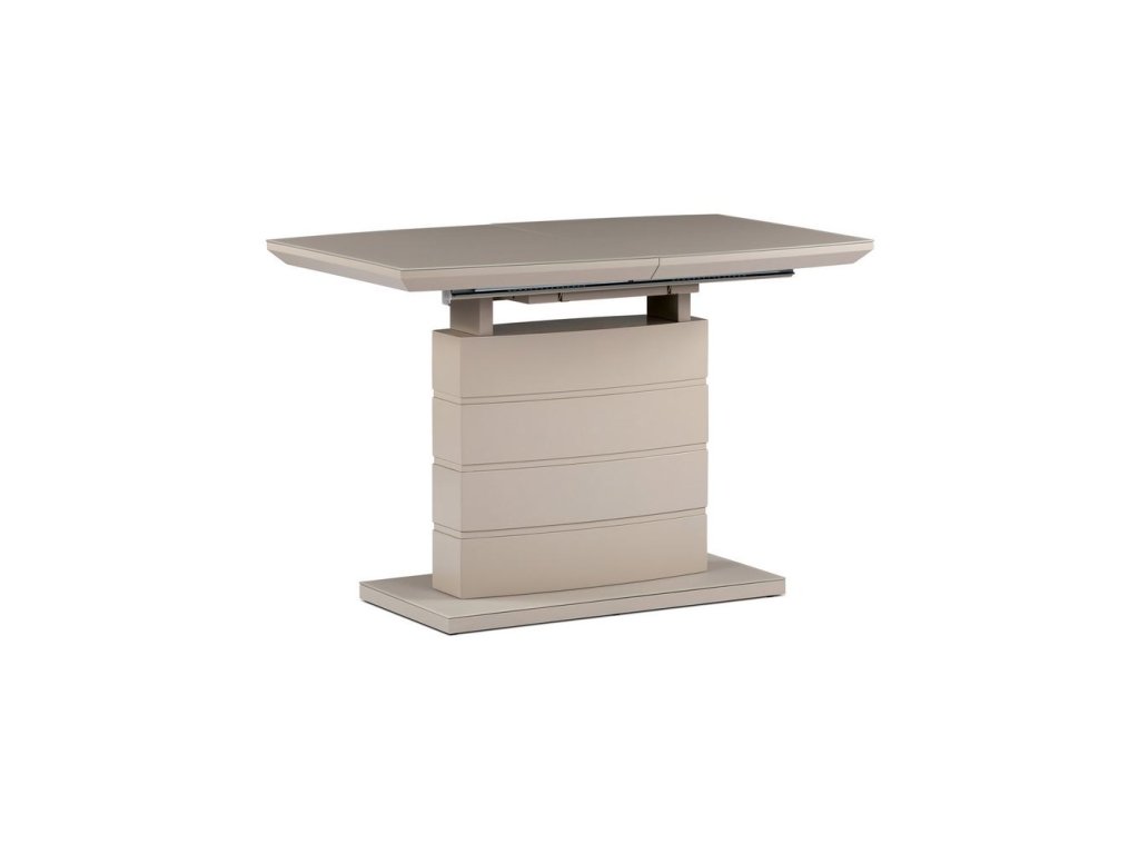 Jídelní stůl 110+40x70 cm, sklo 4 mm cappuccino, MDF, cappuccino mat. Nadčasový, designový jídelní rozkládací stůl o rozměru 110 + 40 x 70 cm. Vrchní stolová deska je tvrzeného skla tl. 4 mm v cappuccino barvě. Podkladová deska, centrální noha a díl rozkladu je z MDF v trendy cappuccino matné barvě. Podesta je z také z MDF a krytá sklem v cappuccino odstínu. Ze spodní části opatřená plastovými kluzáky, eleminujícími poškození povrchů tvrdých podlah. Mechanické součásti jsou kovové.Výška stolu je 76 cm. Ke stolu je možné umístit až 6 židlí.