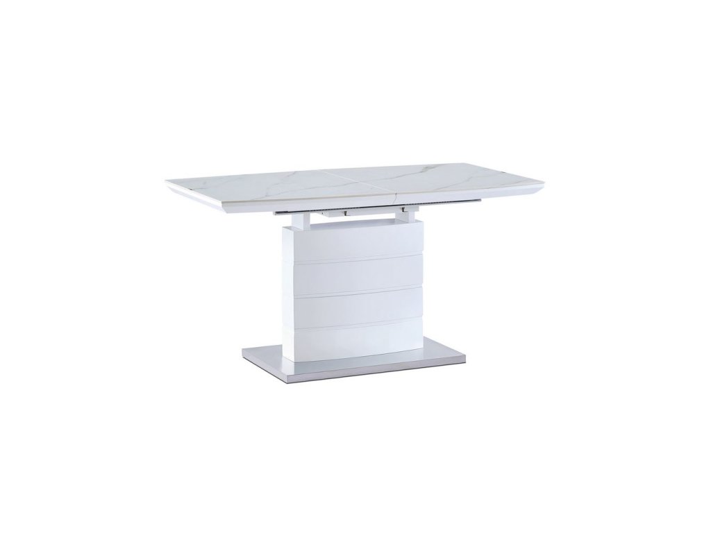 Jídelní stůl 140+40x80 cm, keramická deska bílý mramor, MDF, bílý matný lak. Vrchní stolová deska je z matné tvrzené keramiky tl. 6 mm v dekoru „Italský sněhobílý mramor“. Podkladová deska, centrální noha vkladová deska rozkladu je z MDF v bílé matné barvě. Podesta je z broušeného nerezu, ze spodní části opatřená plastovými kluzáky, eleminujícími poškození povrchů tvrdých podlah. Mechanické součásti jsou kovové.Stůl jistě zaujme svým designem i skvělou kresbou dekoru mramoru v harmonické kombinaci s barvou konstrukce a bude i elegantním prvkem v moderních a klasicky laděných jídelnách, kuchyních a obývacích prostorách.Výška stolu je 76 cm. Ke stolu je možné umístit až 8 židlí.Buďte první, kdo napíše příspěvek k této položce.