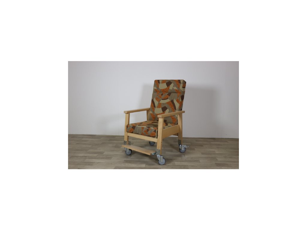 Křeslo je osazeno zátěžovými kolečky a sklopnou podpěrou noh tak, aby bylo možné seniory a méně pohyblivé uživatele v interiéru převážet. Křeslo je konstruováno jako interierové (použití na hladkých podlahách např.PVC, parkety, koberec apod.) a manipulační. Nejedná se tedy o transportní křeslo a křeslo na venkovní použití. Lehké čalouněné křeslo s dřevěnými područkami. Křeslo je vhodné jak pro domácí použití, tak pro hotely, penziony a další ubytovací prostory. Celá vnitřní kostra je vyrobena z masivu. Sedadlo je tvořeno základem z plochých pružin (vlnovce) a doplněné o PUR pěny s vysokou tuhosti. Tvoří tak pevné, ale přitom dostatečně pružné a komfortní sezení. Opěradlo je z komfortní PUR pěny. KŘESLO JE DOPORUČENÉ PRO SENIORY. Područky a nohy jsou vyrobeny z masivu (buk) tak, aby se o ně uživatel mohl vzepřít celou váhou těla.  Ke křeslu je možné zakoupit čalouněné návleky na područky, snímatelný návlek na sedák a opěrák pro snadné čistění nebo podnožku.