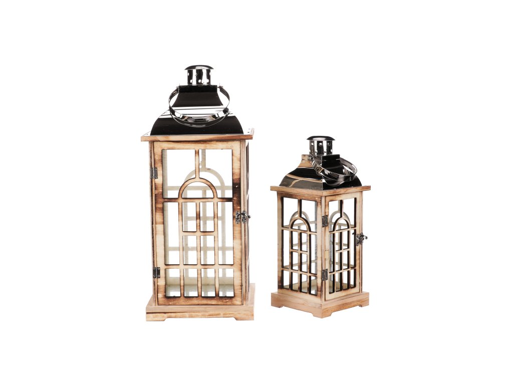 Lucerny dřevěná se stříbrnou střechou, sada 2ks.Vhodné do bytu, na terasu, nebo do zahrady. Rozměry: větší lucerna v. 55 x 23 x 23cm, menší lucerna výška 38 x 15,5 x 15, 5 cm