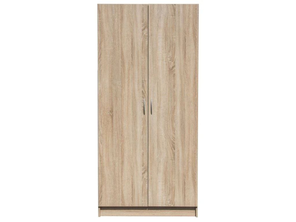 Vysoká šatní skříň s kovovými úchyty. V horní části s jednou polic + šatní tyč. V pravé části jsou 4 police.