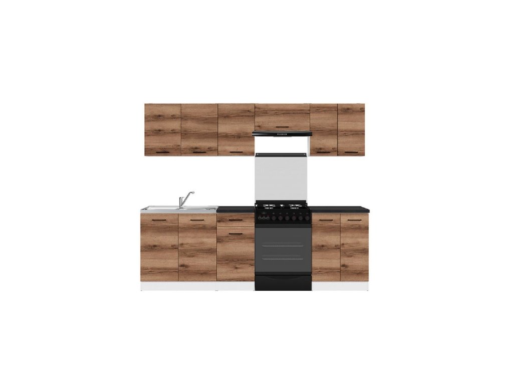 Pracovní desky a domácí spotřebiče nejsou součástí sestavy. Sestava Junona Modul 240 obsahuje: 4x Horní skříňky - dvoudveřová šíře 80 cm G2D/80/57, jednodveřová šíře 40 cm G1D/40/57, nad digestoř šíře 60 cm GO/60/30, dvoudveřová šíře 60 cm G2D/60/57. Ve skříňkách (mimo digestořové) je vždy jedna vnitřní police. 3x Spodní skříňky - dřezová šíře 80 cm DK2D/80/82 (bez dřezu a pracovní desky), jednošuplíková šíře 40 cm D1D1S/40/82 s jednou vnitřní policí, dvoudveřová šíře 60 cm D2D/60/82 s jednou vnitřní policí. 2x Pracovní deska - 1x 60 cm a 1x 40 cm, hloubka 60 cm Barevné provedení: Korpus: dekor Bílá Dvířka: dekor Dub delano tmavý Pracovní deska: dekor Břidlice černozlatá Rozměry Výška skříněk: spodní 82 cm (bez pracovní desky) a 85,2 cm (s pracovní deskou), horní 57,5 cm Hloubka skříněk: spodní 47 cm, horní 30 cm Materiál: Korpus: materiál LTD tloušťky 15 mm, Příslušenství: závěsy Hettich, válečkové kolejničky, plastové rukojeti Na dřezovou skříňku je možné přiobjednat celoplošný dřez.K tomuto modulu je možné přikoupit další skříňky různých šířek. Dřez, baterie a elektrospotřebiče nejsou součástí modulu.Buďte první, kdo napíše příspěvek k této položce.