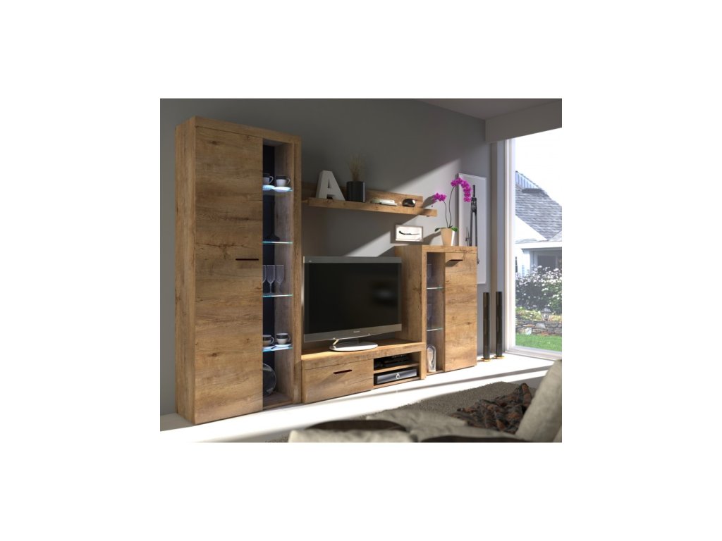 Obývací stěna RUMBA se skládá ze dvou vitrín, televizního stolku a police. Je tedy variabilní, a tak záleží jen na vás, jak vysoko si například připevníte na zdi polici. Možno doplnit LED osvětlením. Vyrobeno z lamina 16 mm.