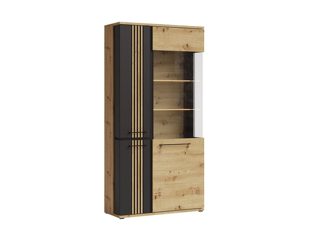 Čelo vitríny je zdobeno jemným rýhováním, které dodává celku jemnost. Vitrína je vyrobena z kvalitní laminované desky odolné proti poškození, poškrábání, vlhkosti. Součástí vitríny je LED osvětlení skleněných polic.