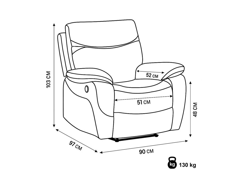 - Šířka 90 cm, hloubka 97 cm, výška 103 cm, výška sedu 50 cm.