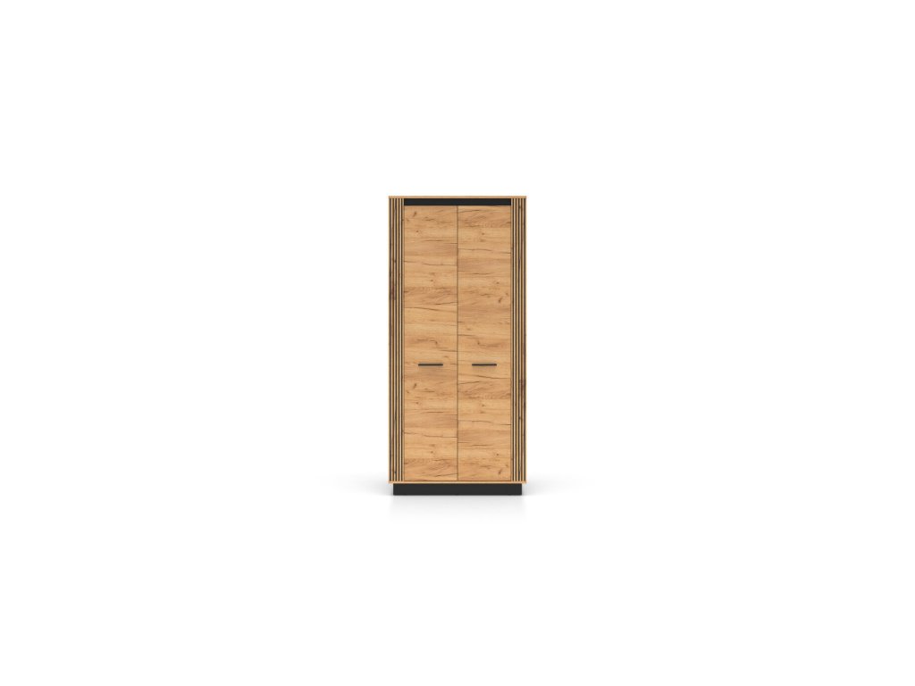 Skříň obsahuje 2 police a šatní tyč. Je vyroben z kvalitního lamina a dvířek z MDF. Přední stěna je doplněna o zajímavý prvek v podobě černého frézování. Nábytek je dodáván vdemontu.