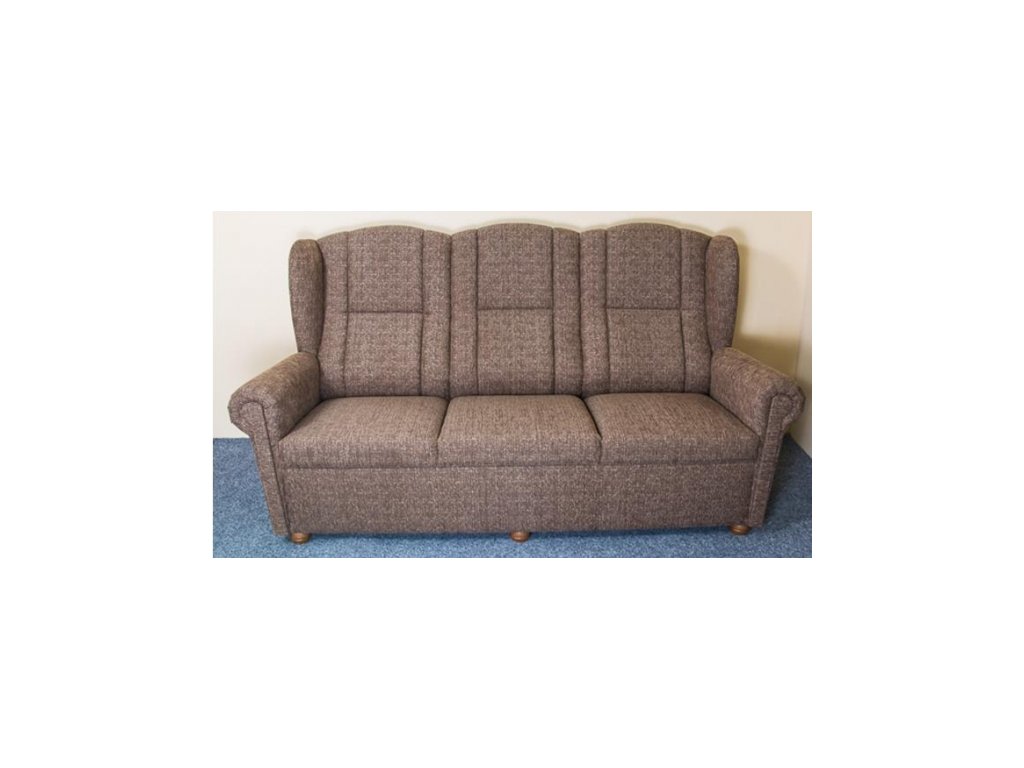 Pohodlná pohovka, u které oceníte především vysokou opěrku hlavy. Bočnice jsou pevně spojené s pohovkou. Výška sedu je 42 cm.Vnitřní rozměr  (mezi boky) 165 cm. K pohovce doporučujeme  praktický ušák a taburet. Sedačku je možno objednat  v různých potahových látkách dle vzorníků.