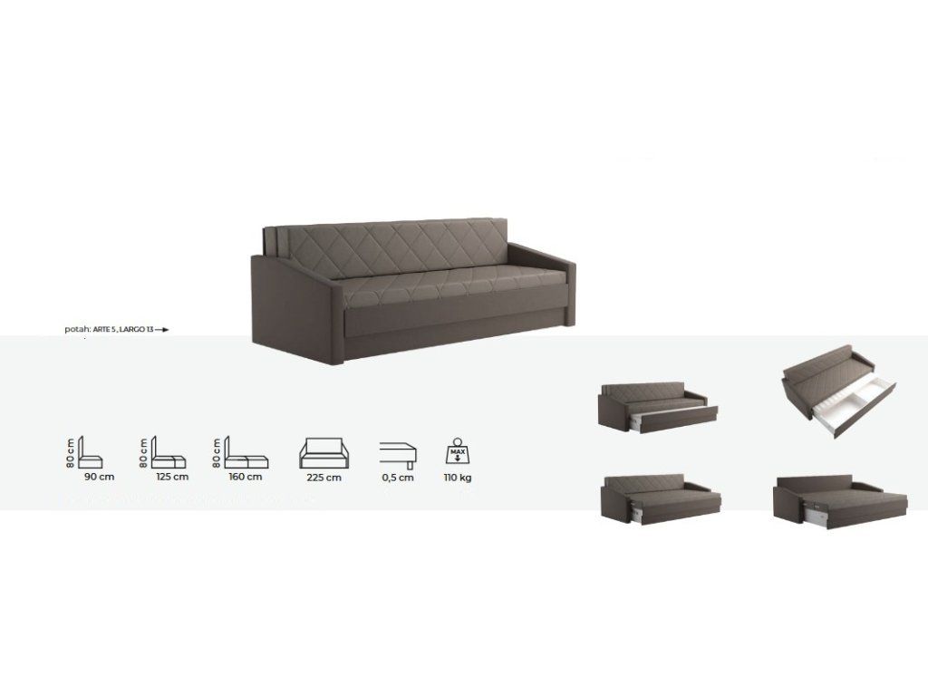 Vhodná pro každodenní spaní. Možnost rozkladu ve třech variantách ložných ploch. Bez rozložení 90x200, částečné rozložení 125x200, úplné rozložení 160x200.